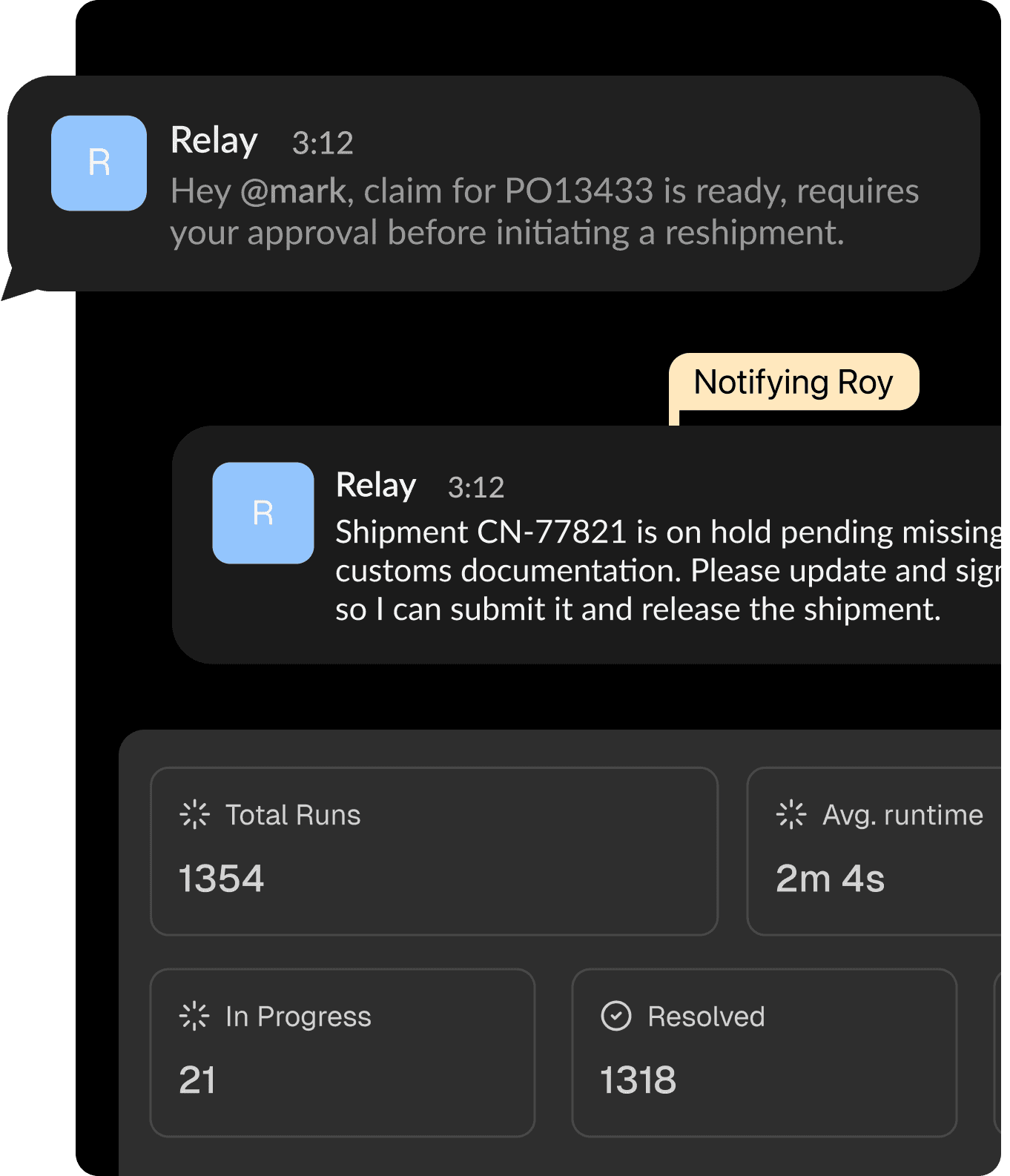 Relay operates 24×7 in the background, monitoring your systems and communication channels for issues as they emerge. When something goes wrong, it takes action automatically. When your team needs support, they can engage Relay directly to resolve the issue. Whether passive or active, Relay executes the process end to end, keeping your team informed without pulling them into every exception.