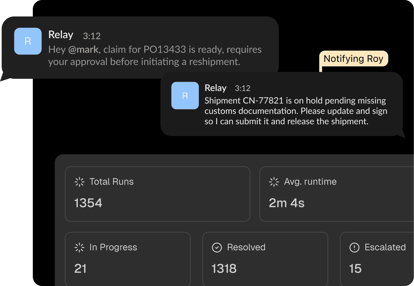 Relay is designed with humans in the loop. Teams define approval points, escalation paths, and guardrails so work never runs unchecked. Relay executes end to end, pauses when human input is required, and escalates exceptions to the right people ensuring automation moves fast without sacrificing oversight.